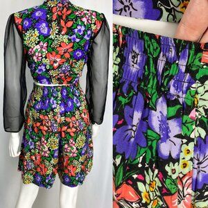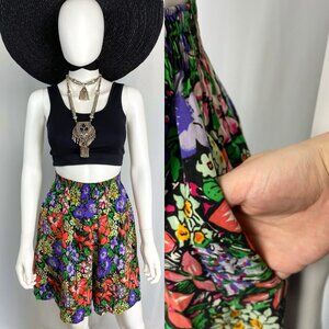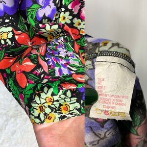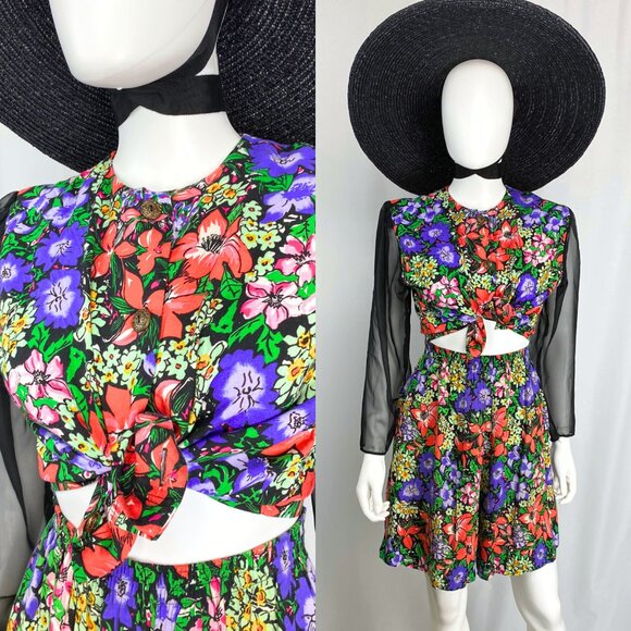 This garden witch two-piece set is so amazing I can't take it! This coord set includes high-waisted shorts and a button-up cropped blouse with shoulder pads and sheer black chiffon sleeves. The shorts have pockets and an elastic waist too. The fabric seems to be a classic drapey 90s rayon with a bright red, green and purple floral pattern against a black background. The top can be worn with the ornate little metal buttons done up, open or tied at the waist. It's likely that a home seamstress added the black sleeves after the fact for a little gothic flair. Try the set with tights and boots to bring it into the autumn season!