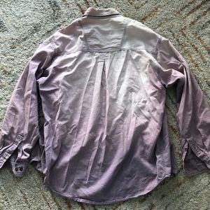 Classic 90's cut button up long sleeve, with box pleat on back for roomy fit. loose fit, unusual dark grey/ purple color fading to light violet almost white on the back. This type of garment washing/ bleaching is no longer used, it was damaging to the fabric. The fabric is very soft due to the chemical washing, very unique. I wore it and added some iron-on patch work to keep it going. Love this shirt.