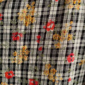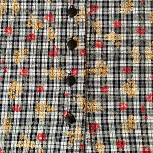 Lovely ditzy demure print that is kind of layered with the black/white plaid on top of which is a small floral print in red, yellow and faint green