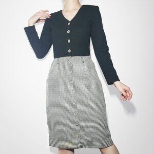 Vintage 90s officecore elegant black & grey houndstooth teacher secretary dress