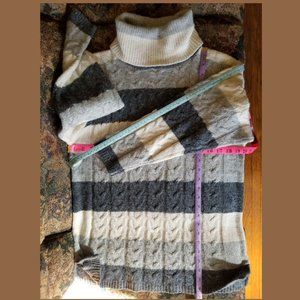 Vintage 90s, attractive designer sweater, cable knit, turtle neck sweater, cream & greys, horizontal stripes, silk & angora rabbit. Turtle neck, made by Franco Valeri designer clothing, size women's closer fit L, looser fit for sizes S, M. Width pit to pit, inches 20, length inches 26.5, sleeve inches 19. Colour cream, pale gray, dark gray in wide stripes. Versatile, looks good with pants, jeans, leggings or a skirt. Suitable for the office.