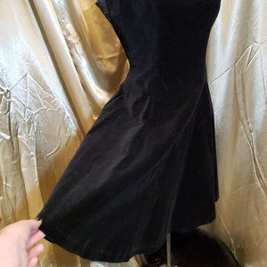 Stunning 90s velvet dress by Esprit. Made of 100% cotton velvet. Features a scoop neckline in front, and a deep v back, with wide bra-friendly straps. It also has lace insets on the sides that are not original to the dress. I added these myself to give it a bit more room in the bust, but sadly the dress is now too small again. I used a really pretty lace with a retro looking design in it, but this could also be easily removed if desired.