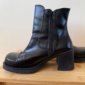 black leather, chunky boots, ankle boots, platform sole, grunge style, elastic panels, square toe, block heel, vintage footwear, edgy footwear