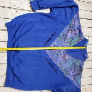 This is definitely an iconic '90s sweatshirt! Quarter zip. It has no size on it, it fits oversized, I would say Large though. I fit size medium/large and it's baggy on me. I am 5'6 for reference. Measurements are also in the photo.