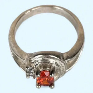 This brightly coloured vintage ring measures as a size 5. Made of 925 sterling silver, this piece features a light red cut garnet stone beside two small white glass rhinestones, set in a silver swirl. This ring is stamped 925 inside the band.