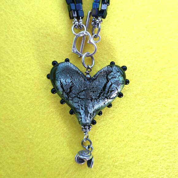 Vintage 925 Silver Handcrafted Art Glass Hematite Boho Heart Statement Necklace