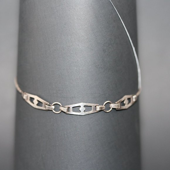 Beautiful delicate looking classic snake link Silver bracelet. It is marked 925 with a C^A . Needs a polishing but in very good condition. Measures 7 inches end to end. Please see photos. Very pretty design with 3 larger geometric links in the middle.