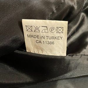 70% wool, 30% polyester. No size tag. Fits Small.
