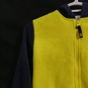 This vibrant fleece jacket features a striking yellow front with contrasting navy sleeves and hood, offering both style and comfort