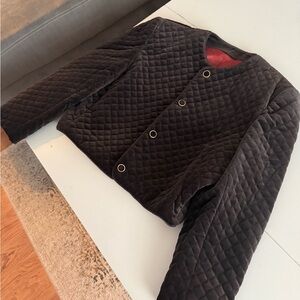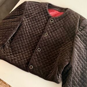 Vintage ALFRED SUNG Cropped Quilted Jacket, dark brown velvet, with red lining.