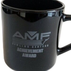 Vintage AMF Bowling Centers Achievement Award Coffee Cup. Cup Is Black with Grey Lettering. All But A Couple Of Light Scratches Cup Is In Good, Pre-Owned Condition.
