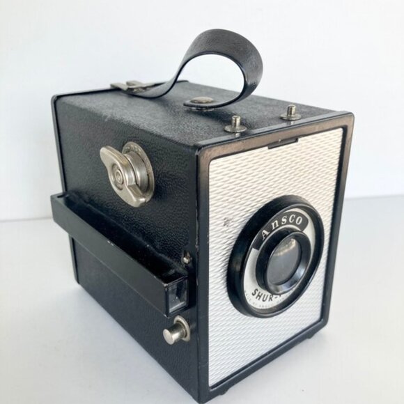 Although the Ansco Shur-Flash is a simple camera made from cardboard, wood and metal, it is particularly well made. It is capable of capturing eight 2 1/4 x 3 1/4 inch exposures on standard no. 120 roll film. This basic box construction hadn't changed much from when box cameras first appeared half a century earlier. The camera is made of a water resistant fiber body covered in black imitation leather, with a decorative stainless steel faceplate. The back is also made of metal. The shutter assembly is supported with a wooded block. There is a plastic handle on the top.