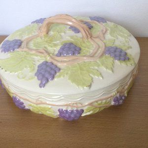 It is a very nice elegant jar container with lid hand-decorated purple grapes marked by artist Jeanie