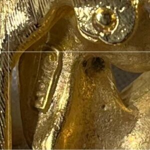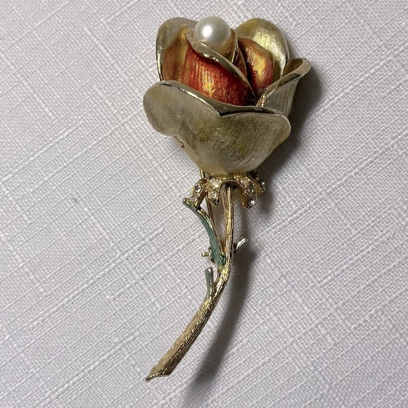 This exquisite brooch features a stunning gold and red rose design, accented with a lustrous pearl. Perfect for adding a touch of interest to any outfit.