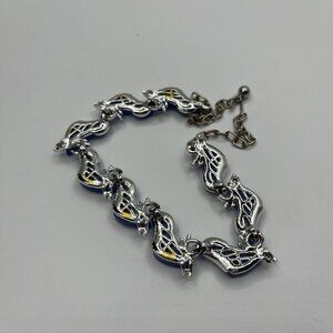 Another fabulous find for the ART jewelry collectors! The necklace is a gorgeous shade of periwinkle opaque blue. Nine individual thermoset abstract shaped pendant as are hinged together to form a 16 inch necklace end to end. The necklace is 1/2 inch wide. Marked ART on the necklace.
