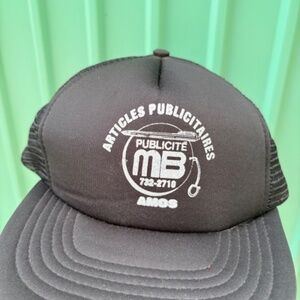 Vintage ARTICLE PUBLICITAIRES MB AMOS trucker hat black snapback quebec
