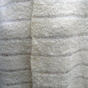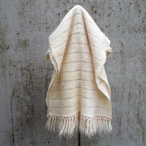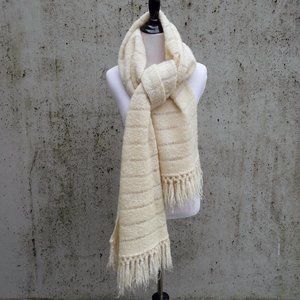 Great scarf by Au Terroir of Ste. Madeleine, Quebec, Canada. The style of tag implies 1970s. There is no fabric content tag, but it feels like wool or a wool blend. The color is beige or cream. Unique loose weave.