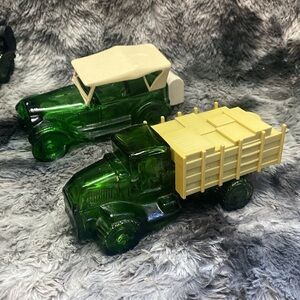 Explore the charm of these vintage Avon glass toy car set. Featuring , vibrant green, and classic yellow colors, these toys are perfect for collectors and kids alike. Add a touch of nostalgia to your collection with these beautifully crafted pieces.