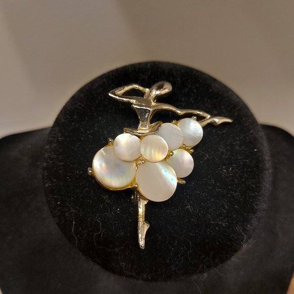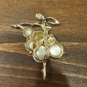 Brooch is gold toned Ballerina shape adorned with multiple circular accents forming the dancers skirt. Pin back is sharp and ready to wear.
