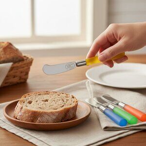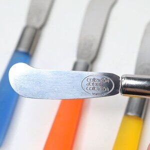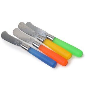These stainless steel spreader knives are perfect for soft cheese, butter, jams, pâté, and other condiments. Each knife features a frosted Lucite handle with a different vibrant colour accent inside (e.g., Yellow, orange, Blue, Green). The fun, modern design makes them an instant statement piece for entertaining.