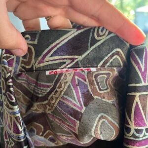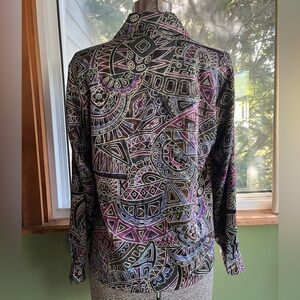 Stylish button-up shirt with a vibrant geometric pattern. Features shades of purple, black, and white with gold accent buttons