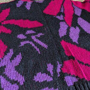 Add a vibrant pop of color to your wardrobe with this unique vintage sweater! Featuring an abstract floral pattern in striking shades of pink and purple against a black background, this sweater is a true statement piece. With its soft, cozy knit and cropped fit, it’s perfect for layering or wearing on its own.
