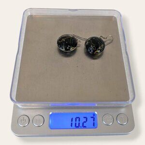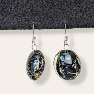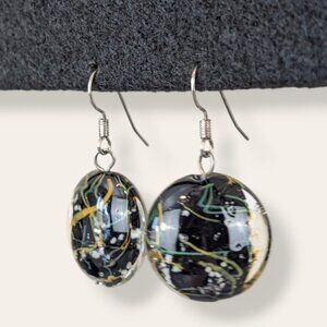 These vintage earrings are made of glass and have simple hook findings made of a silver tone metal. The earrings each feature a clear glass "bead" with a black core and orange, white, and green abstract accents. In my mind, it looks almost like an organic subway system. The earrings have normal wear, but no issues affecting wearability. There are no chips, cracks, or breaks in the glass.