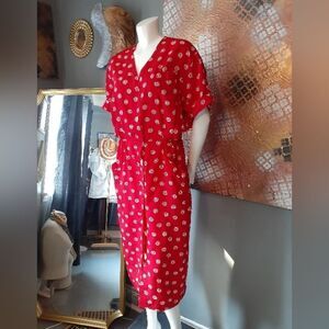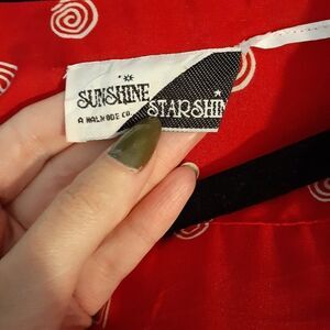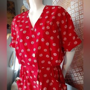 vintage abstract spiral print button down midi dress. authentic item from the 1980s. purchased at Siberia Vintage in Hamilton Ontario. vibrant red and white. front pockets with elastic waist. no material tag but most likely polyester fabric.