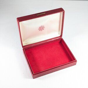 A vintage Acushnet box, likely used for packaging golf balls or other small items. The box is red on the exterior in a paper that mimics ostrich leather and has a white satin lined interior lid with a red snowflake-like logo. The interior base is lined with red felt. Acushnet is a company known for manufacturing golf equipment, particularly golf balls, under the brand Titleist. The outside has a little golf club- pattern around the edges.