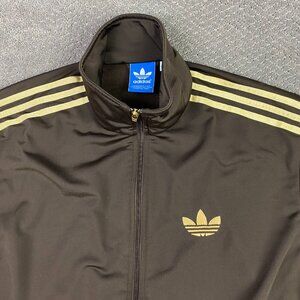Stylish adidas performance jacket. Features iconic gold stripes. Comfortable and sleek design. See flaws in photos.