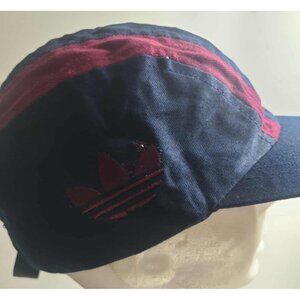 This vintage Adidas hat features a classic black design with the iconic three stripe logo in white. Made from cotton, this adjustable baseball cap is suitable for men and has a timeless style that is perfect for casual wear. The one size fits all design makes it a versatile accessory that can easily elevate any outfit with its retro charm and sporty appeal.