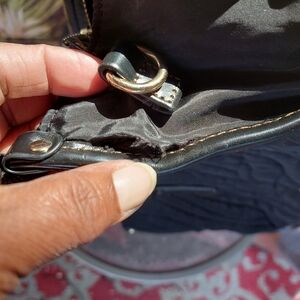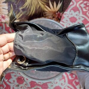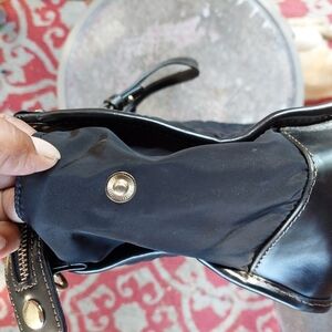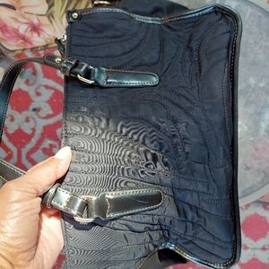 Black quilted bag. Medium. Multi-compartments. 3 zippered sections plus 2 snap sections. Satchel style. Note no over shoulder strap. Approx 12" x 8". Double straps approx 5" from center. Adolfo Dominguez.
