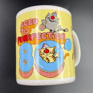 This cheerful mug showcases an array of playful cats, each uniquely celebrating, set against a sunny yellow background. The phrase "Aged to Purr-Fection" is prominently displayed in a fun, bold font alongside the number "80," making it a perfect milestone gift.