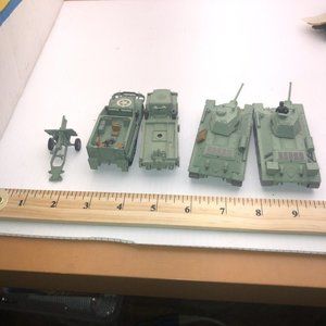 This vintage collection from Airfix includes 5 pieces of WWII US Army vehicles, perfect for collectors and enthusiasts alike. The lot features a truck that is missing its winch, along with various tanks and military vehicles. The brand is well-known for its quality and attention to detail, making this set a must-have for any military or toy vehicle collection. Whether you're a history buff or just appreciate well-made toys, this Airfix set is sure to impress.