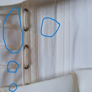There are extra straps and pieces of steel boning in the box as well as the steel boning inside the piece. Lace up sides, silver metal hardware, adjustable. Snaps and hooks. There are some dirty spots and stains. They are extremely minor and I have not tried to clean it.