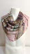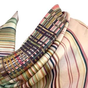 Elegant vintage Aker 100% silk scarf featuring soft pastel stripes with a central geometric plaid accent. This oversized square measures 34 inches and is finished with hand rolled edges, giving it a refined, luxury feel.