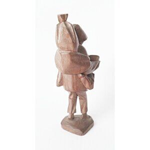 For your consideration is a vintage hand carved wood Folk Art sculpture of a traveler with barefoot carrying a bag and two bowls.