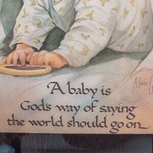 This vintage 1984 Alan Grant wood wall plaque embodies the charm of mid-century decor. Featuring a delightful baby quote this print has been decoupaged and gives it a nostalgic nod to cherished moments. This has a playful yet soothing touch that will complement any nursery or child's room.
