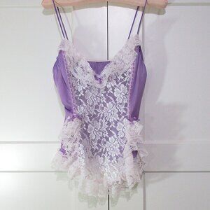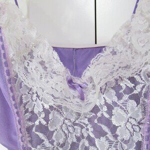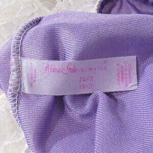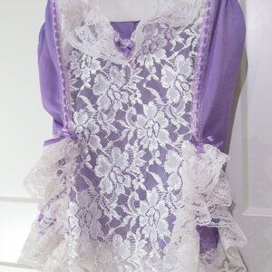 A pretty mini babydoll top from Alana Gale. If you love lace, this is for you. Pretty violet nylon embellished with dripping white lace down the front, around the hem, and at the bust. I just love the sheer ruffled hem, the pleated lace shoulders, and the gorgeous lace across the bust. The little soft skirt is and soft and flouncy. Excellent vintage condition. It's tagged size Large and it measures up to 21 inches maximum from underarm to underarm -- I think it's perfect for someone with a 38 inch chest. It's 27 inches long...short and flirty! Panties not included.