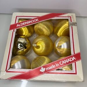 Celebrate the holiday season in style with this set of 9 vintage Alderbrook gold satin sheen ball ornaments. Please note, one ornament is different than the others and is not part of the original set. Each 2.5 inch round ornament features a shimmering gold color and a classic design that will add a touch of elegance to your Christmas tree decorations. Made of unbreakable styrofoam wrapped in satin thread. The durable satin material exudes a luxurious feel. These ornaments are perfect for both decoration and nostalgia, bringing a vintage charm to your holiday festivities.
