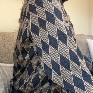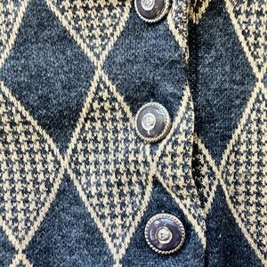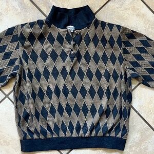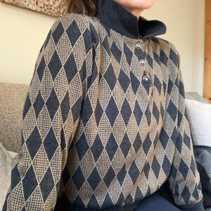 Rare find. Vintage Alfred Dunner Ladies 3 Button Top Pullover Sweater with popped Collar. Grey and beige diamond pattern. Grey cuffs and collar and waistband. Very pretty buttons. Has shoulder pads. Made in the USA Excellent condition.