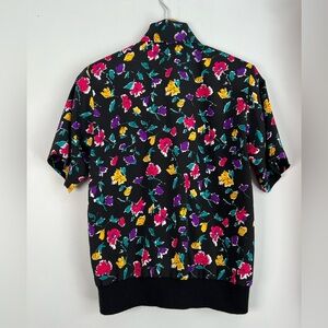 Incredible vintage set with an all over floral print. Black background with pink, purple and yellow flowers. The skirt would be a midi style, pleated and really flowy. The matching blouse has short sleeves, elastic waist which provides definition, and the faux scarf tie at the top. Also has shoulder pads, but the way they are stitched in makes them easily removable if desired. Polyester, but the really soft and sleek type that almost has a silky feel to it! Don’t miss out on this amazing 90’s piece.