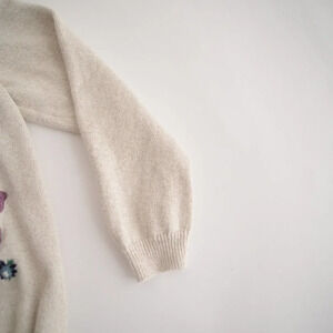 The cream backdrop provides a sophisticated canvas for the intricate floral knit design in shades of purple and blue, adding a pop of color and femininity to your ensemble. The mockneck style exudes understated elegance while providing warmth and versatility.
