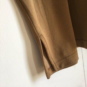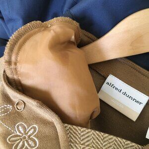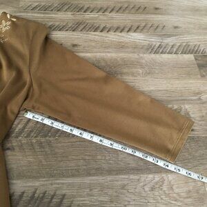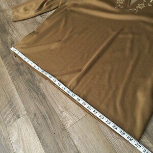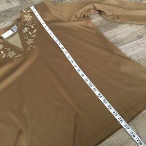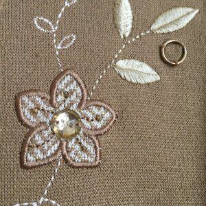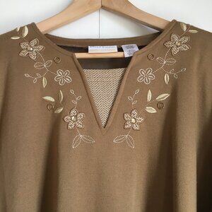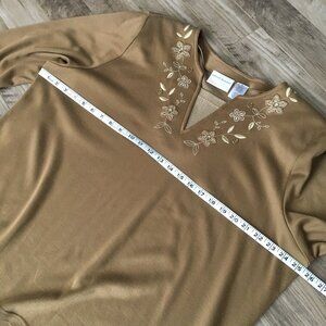 Very good preowned vintage condition, tunic-style fabric-insert neck, long sleeved sweater by Alfred Dunner featuring white and tan embroidery and diamondesque gems on a doe-brown knit fabric. Shoulder pads are beautifully inserted and fabric is a soft knit. A nice quality slow fashion vintage piece.