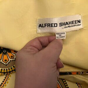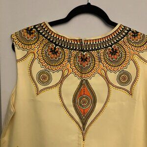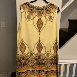Shaheen was one of the great 1960s screen painters. This is a mandala, a symbol he used frequently. The dress is in excellent condition, and is made of an unusual matrial that's a thin vinyl. It looks great on!
