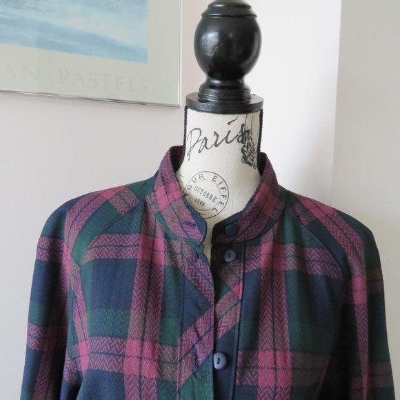 Vintage Alia purple navy and green plaid light bomber jacket with buttons up the front. This lightweight jacket has 2 pockets on the seam on each side and it is not lined. A portion of the hem has an elastic waistband so it has some give. The jacket is a women's size Large. I've included some measurements in ensure a good fit: