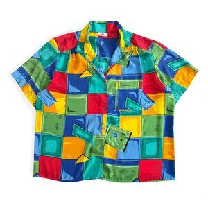 Vintage colourful short sleeve button up shirt, that has a bold geometric block patter. Style is reminiscent of 80s & 90s.