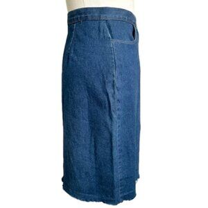 Stretch denim, raw hem, knee length skirt in the PERFECT blue jean colour! Made out of 96% cotton / 4% elastane by older Reitmans.
