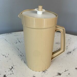 Vintage Tupperware 800 Pitcher – Almond – 2 Quart – Push-Button lid, Tupperware 800 series pitcher in an almond color. This pitcher holds approximately 2 quarts (64 oz) and features the push-button lid, making it easy to open and pour with one hand.