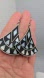 Beautiful vintage Alpaca Mexico dangle earrings featuring flared triangle shapes with black inlay and shimmering abalone shell accents.